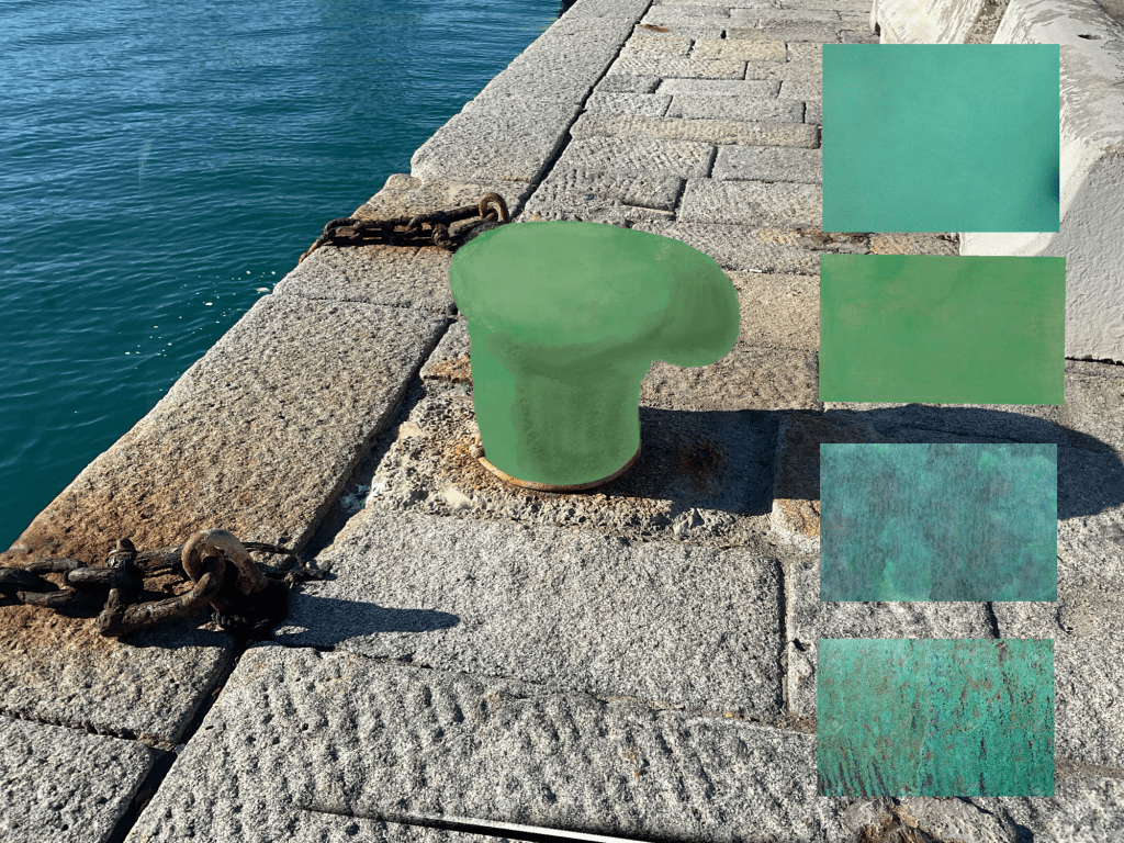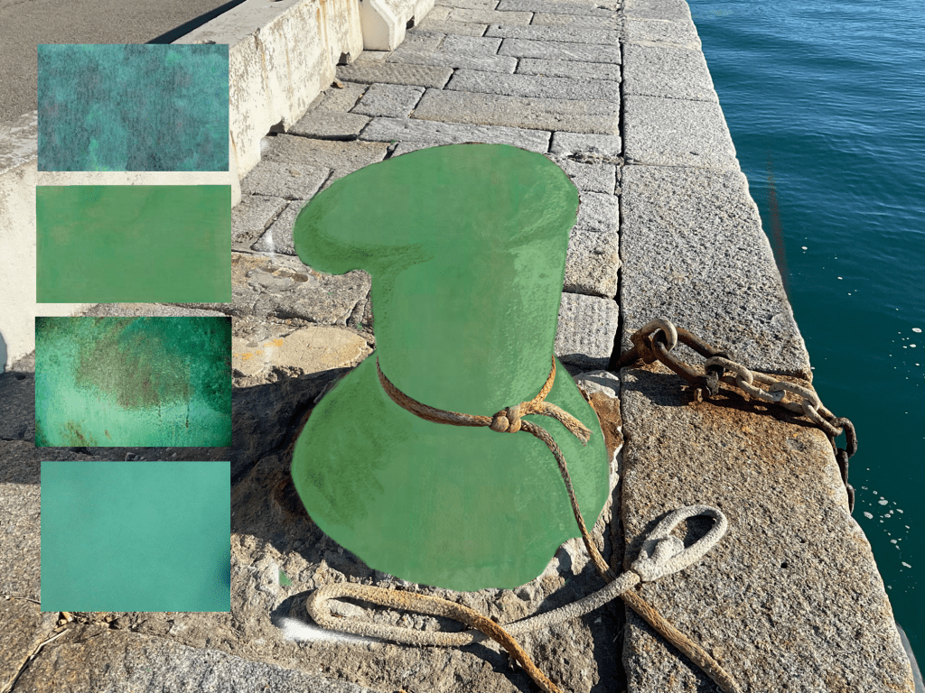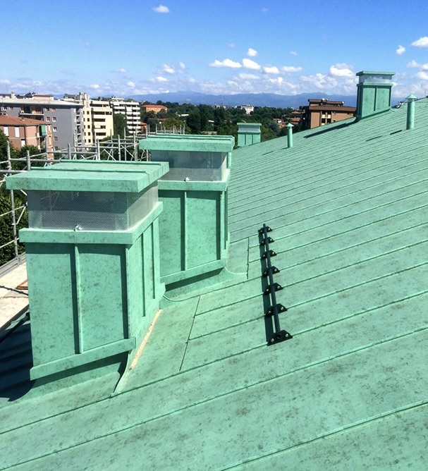 Dopo vari tentativi abbiamo individuato il colore del rame ossidato come rispettoso del contesto.